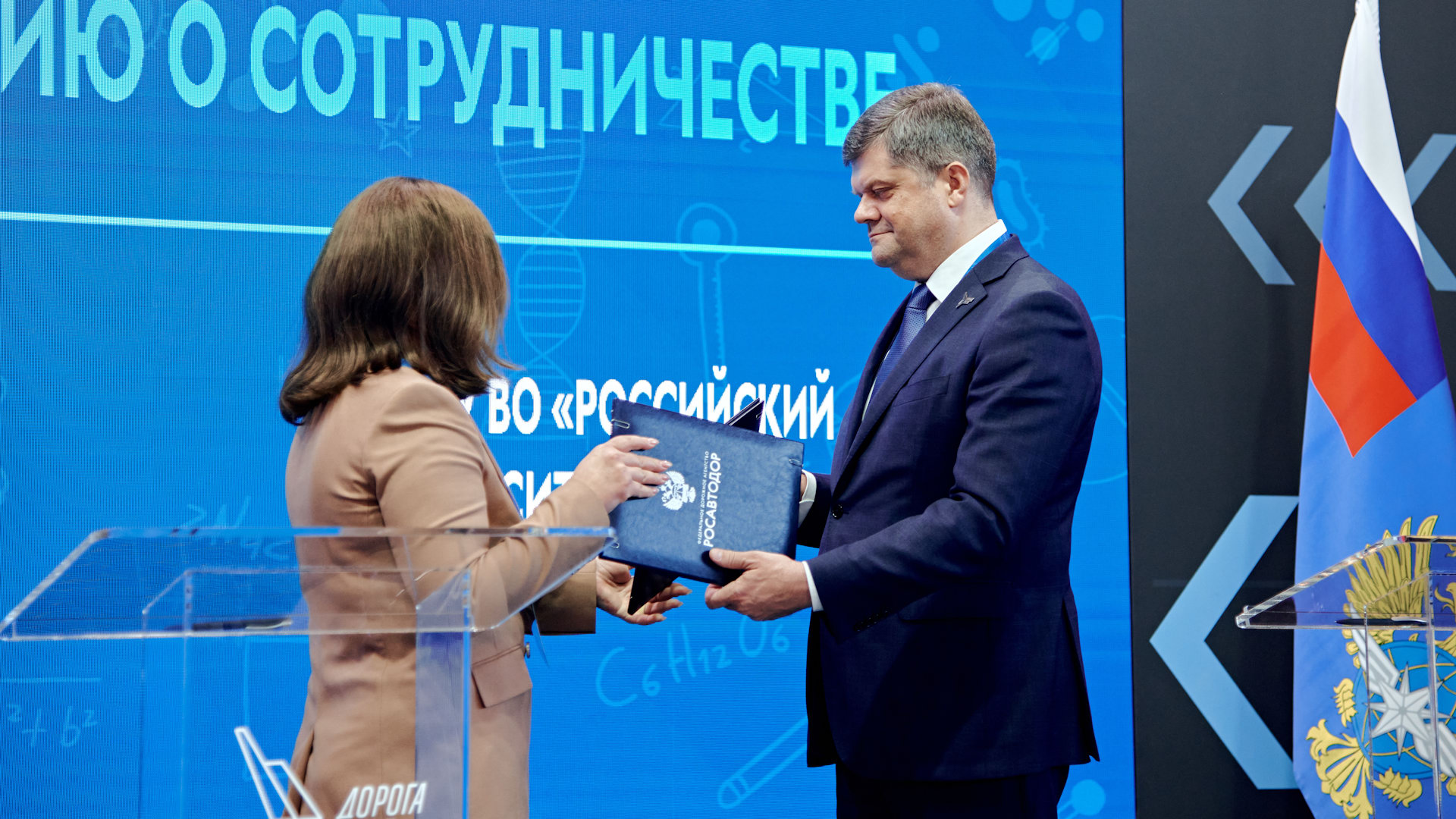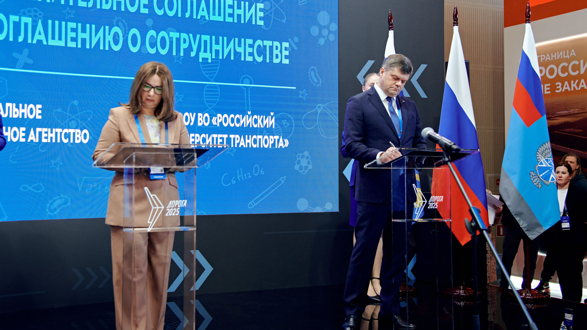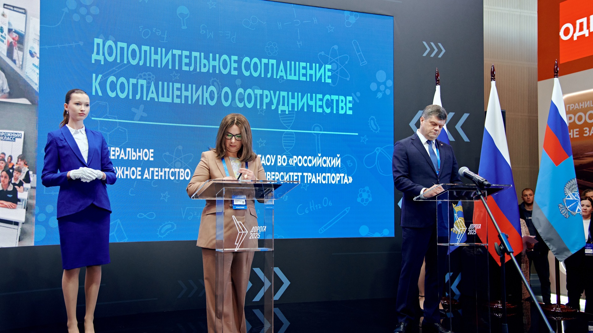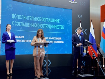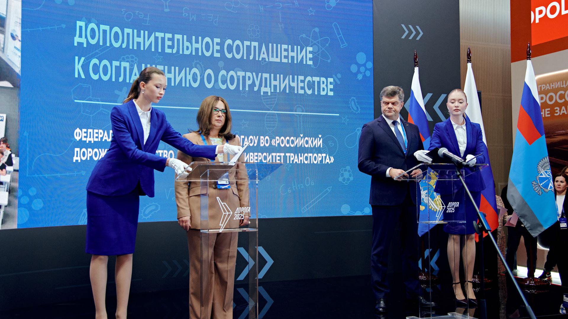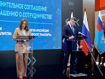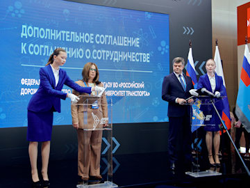 Также в рамках мероприятия состоялась церемония подписания Дополнительного соглашения к Соглашению о сотрудничестве между Федеральным дорожным агентством и Федеральным государственным автономным образовательным учреждением высшего образования «Российский университет транспорта». Свои подписи под документом поставили заместитель руководителя Федерального дорожного агентства Олег Ступников и проректор Российского университета транспорта, доцент кафедры «Теория права, гражданское право и гражданский процесс» Юридического института Татьяна Марканич.