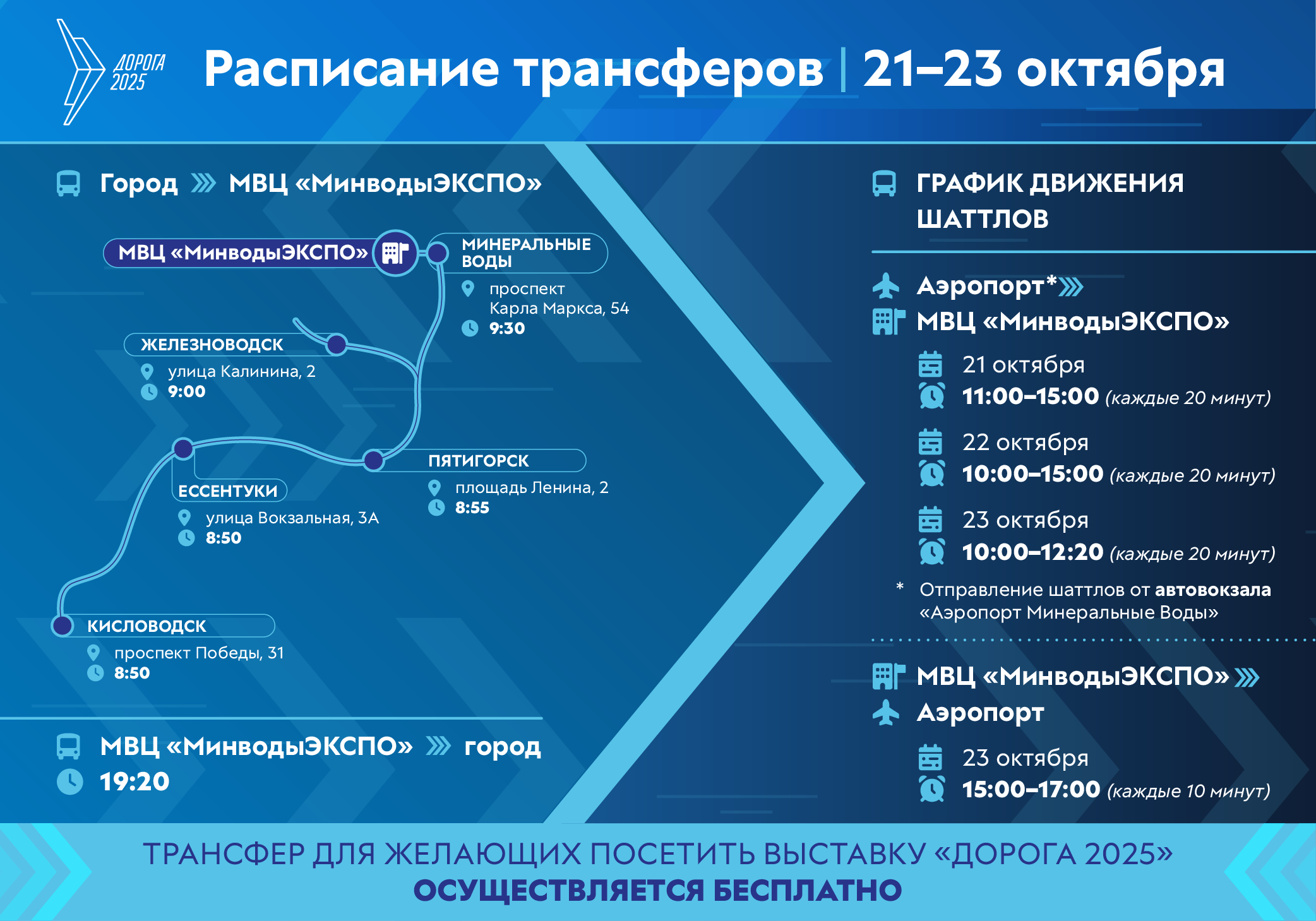 В период проведения Международной специализированной выставки «Дорога 2025» с 21 по 23 октября 2025 года будет организован трансфер участников и гостей выставки автобусами к месту проведения мероприятия в МВЦ «МинводыЭКСПО» (Ставропольский край, Минераловодский городской округ, х.Красный Пахарь, ул. Автомобильная, 31).